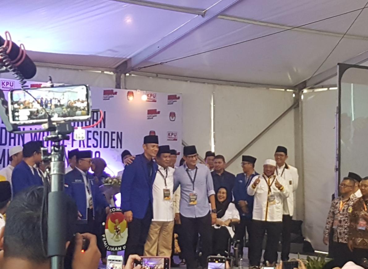 Calon presiden (capres) dan calon wakil presiden (cawapres) Prabowo Subianto-Sandiaga Uno mendatangi kantor Komisi Pemilihan Umum (KPU) pada Jumat (10/7) pukul 13.35. Pasangan calon (paslon) Prabowo-Sandiaga diusulkan oleh koalisi yang terdiri atas empat partai politik, yakni Partai Gerakan Indonesia Raya …