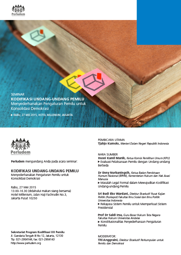 JAKARTA (27/5) – Perludem menggelar Seminar Kodifikasi Undang-Undang Pemilu: Menyederhanakan Pengaturan Pemilu untuk Konsolidasi Demokrasi. Hadir sebagai narasumber Ketua KPU RI Husni Kamil Manik, Guru Besar FH UI Prof. Topo Santoso, Direktur Puskapol Fisip UI Sri Budi Eko Wardani, Direktur …